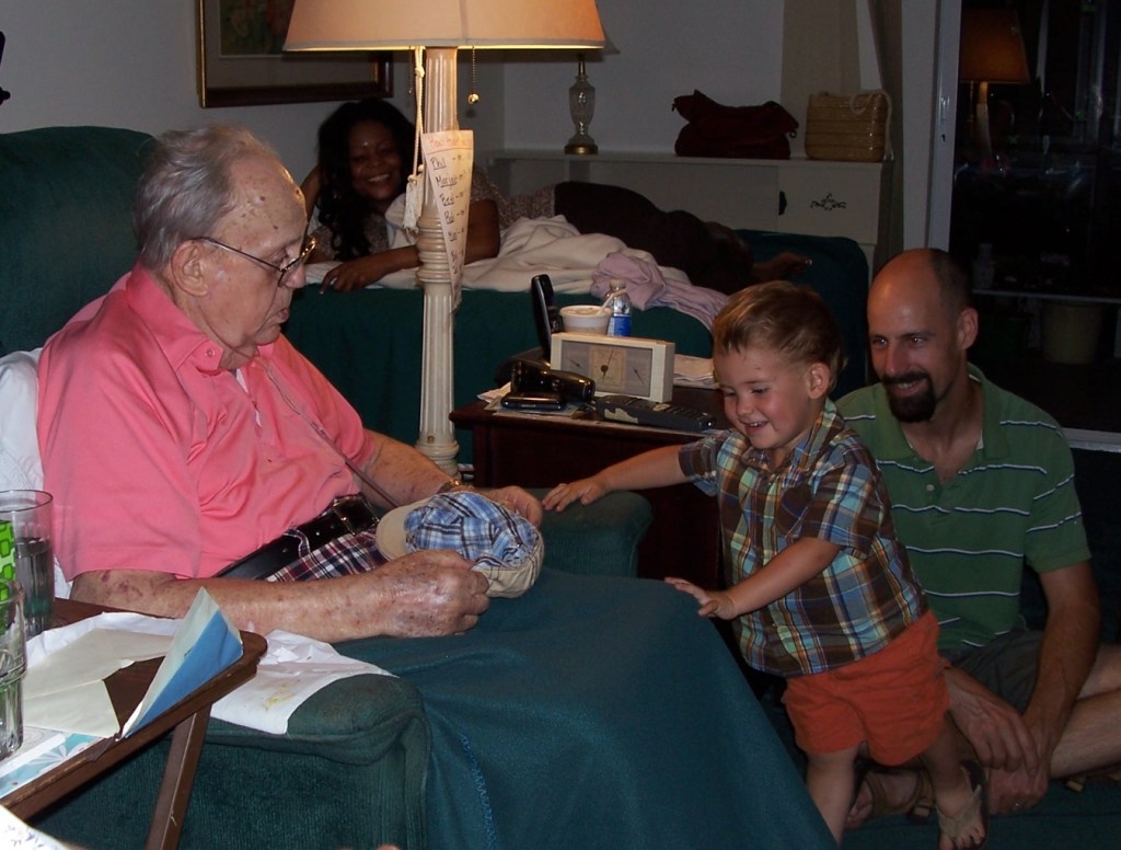 Shortly before Dad died, still able to have fun with a great-grandboy