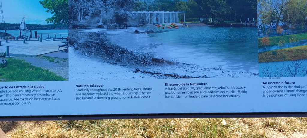More recently, rehabilitation of the area created green space that now offers wide open vistas of the river and views of the opposite shoreline of the Hudson. Informational kiosks and informational plaques explaining the origin of the park are scattered throughout the nineteen acre open space (in English and Spanish). Views of the Hudson, looking both north and downstream, make this a delightful place to spend an hour or two watching boats travel by.