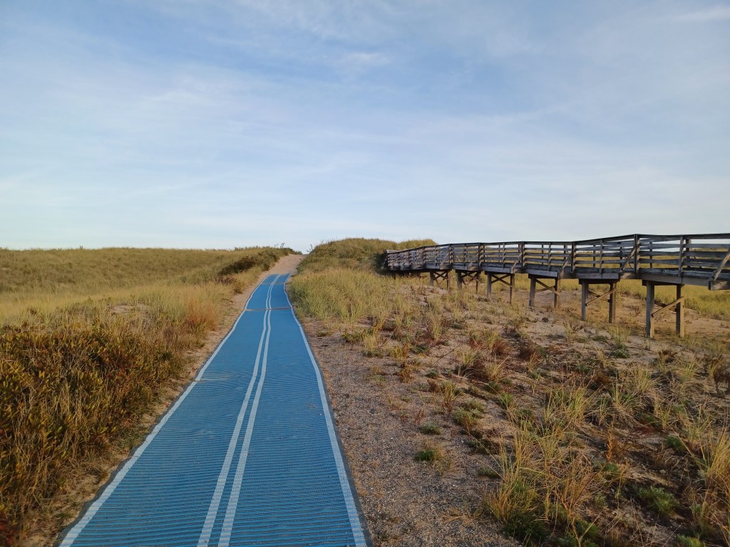 We had some daylight left after our bike ride so we headed over the bridge (in our truck) to Newburyport and took a walk at Plum Island National Wildlife refuge. We set out for a seaside walk on firm sand, with just enough time before sunset to take in the waves and the incoming tide. The entry to the first access point has mats that allow for handicapped access through the dunes to the waterline. The gate to this entry point was shut. It appeared that a storm had washed out a portion of the dune that supported the mat, potentially making it an unstable surface for those most likely to need the mat for support. A boardwalk is also available but the steps can provide a barrier to some visitors.