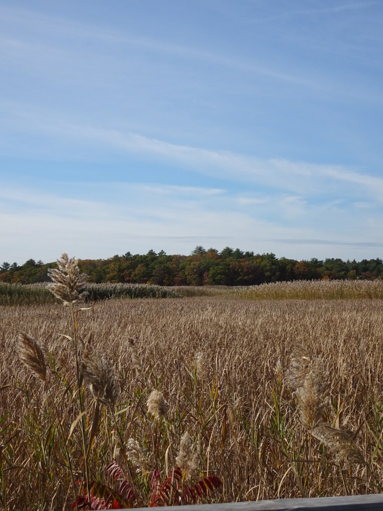 Salisbury, Massachusetts offers a wonderful rail trail network that provides marsh views, woodland paths and an overlook of the Merrimack River. Our visit was on a perfect fall day, with little if any wind. Bright autumn colors glowed in the sunshine. We saw few other people using the trail, which surprised us, since we were there on a weekend.