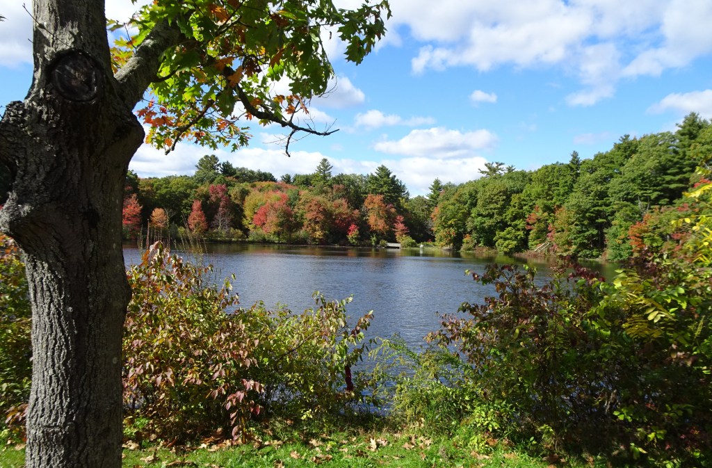 The trail guide, Easy Walks South of Boston includes over fifty open space areas in seventeen contiguous towns south of Boston, thus the title. I recently visited several of these paths on a beautiful, blue-sky day in early fall. We saw touches of color but nothing like the show that awaits us in autumn in New England.