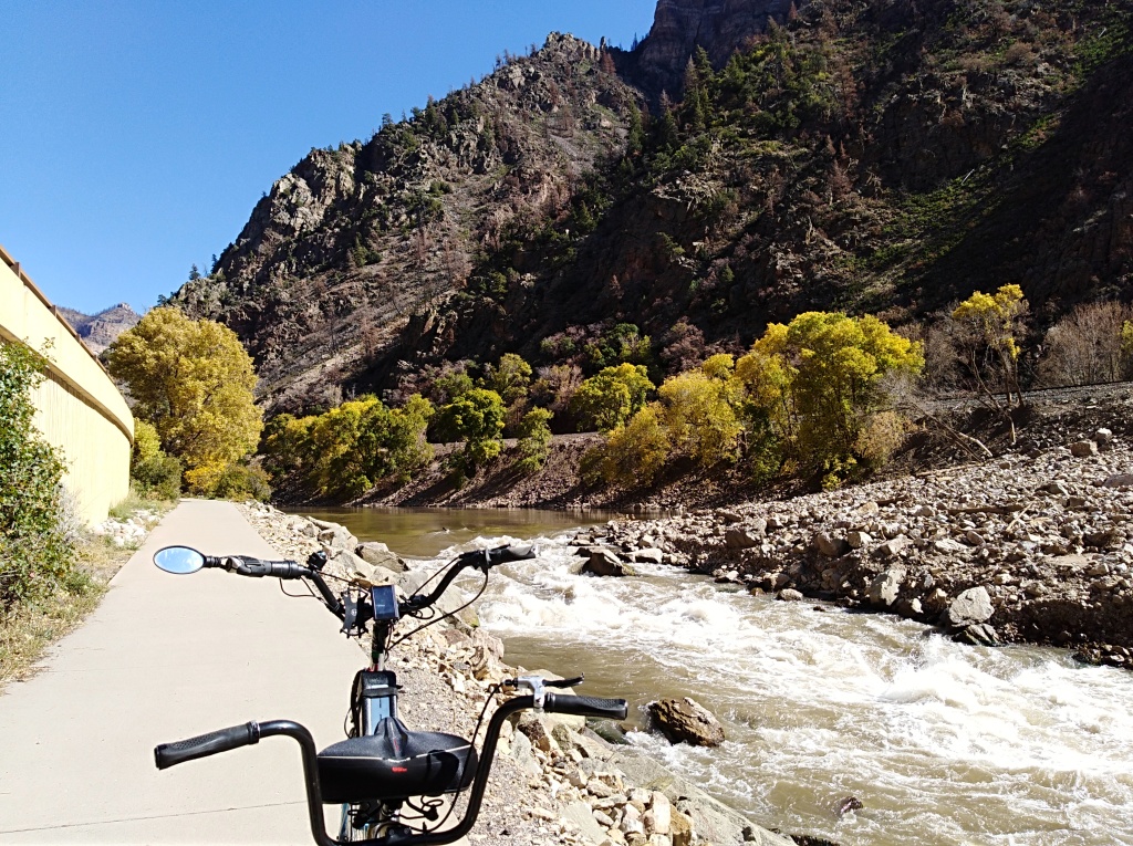 When we first built our adaptive tandem bicycle (thanks to Roulez Cycles of Lynn, MA) that comes apart into three pieces (thanks to the S&S couplings that are built into the bike), my huband started dreaming of getting me (and the bike) out to the Glenwood Canyon rail trail. He hoped we could ride on the rail trail that traverses the canyon alongside the Colorado River. It took three years, but we finally made it out to the canyon, and set out on the trail.